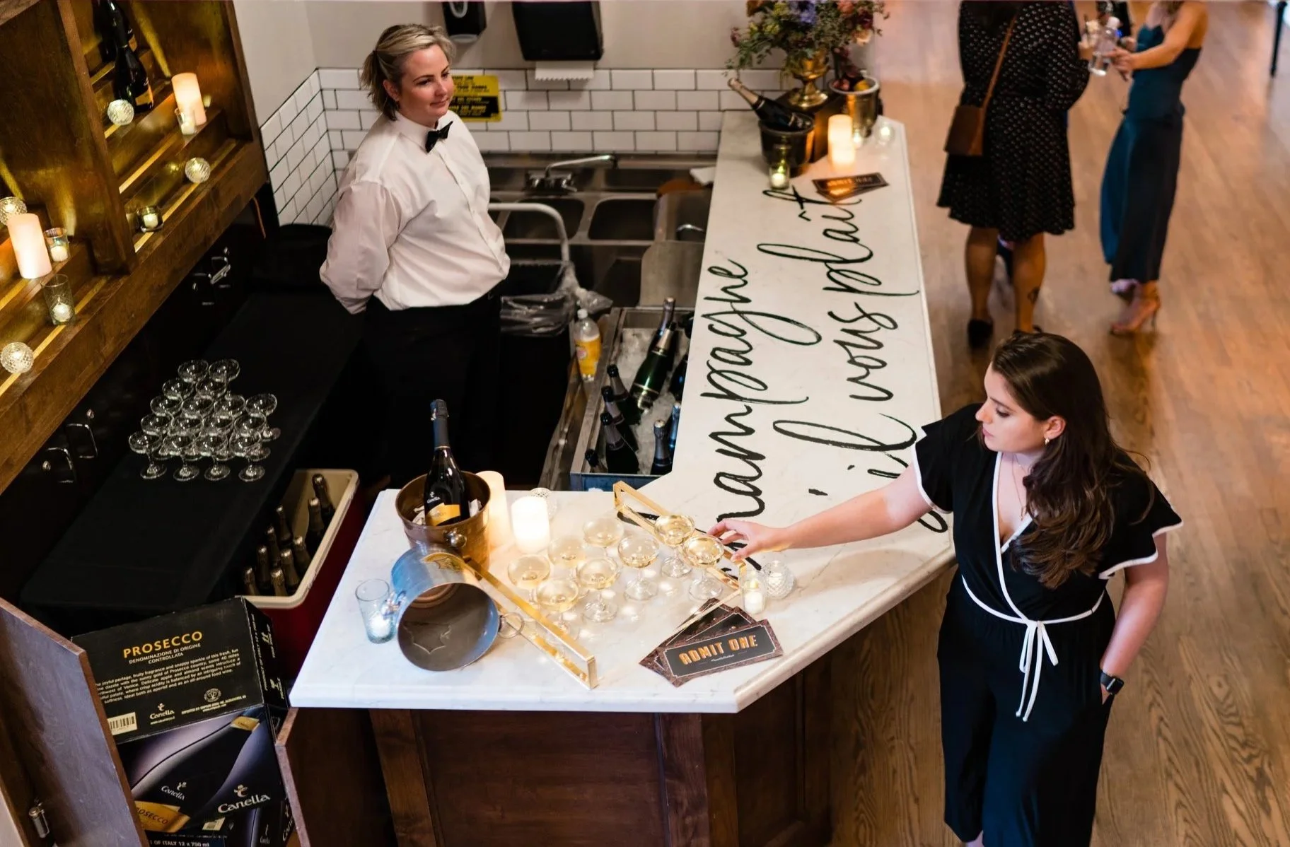 Bar area with a bartender behind the counter and a woman in a black dress reaching for a glass. The bar has bottles of champagne, glasses, and a sign that says 'BOTTLE ONE'. The bartenders and customers are in a lively restaurant or bar setting with candlelit decor.